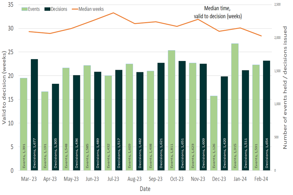 Figure 1: Number of events held , decisions issued and median time between valid date & decision date; March 2023 to February 2024.