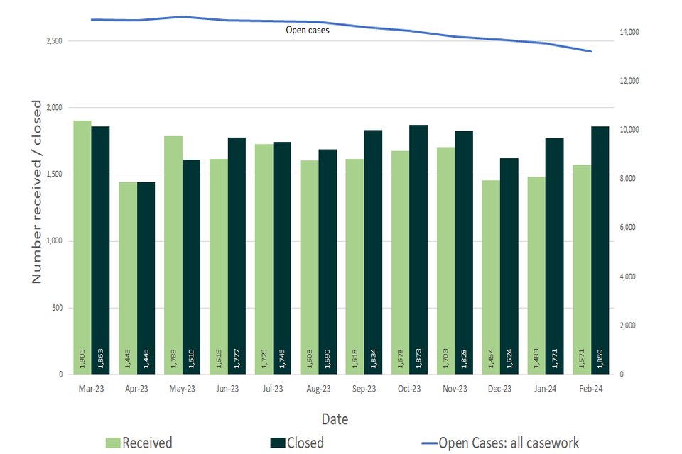 Figure 2: Number of cases received, closed and open; March 2023 to February 2024.