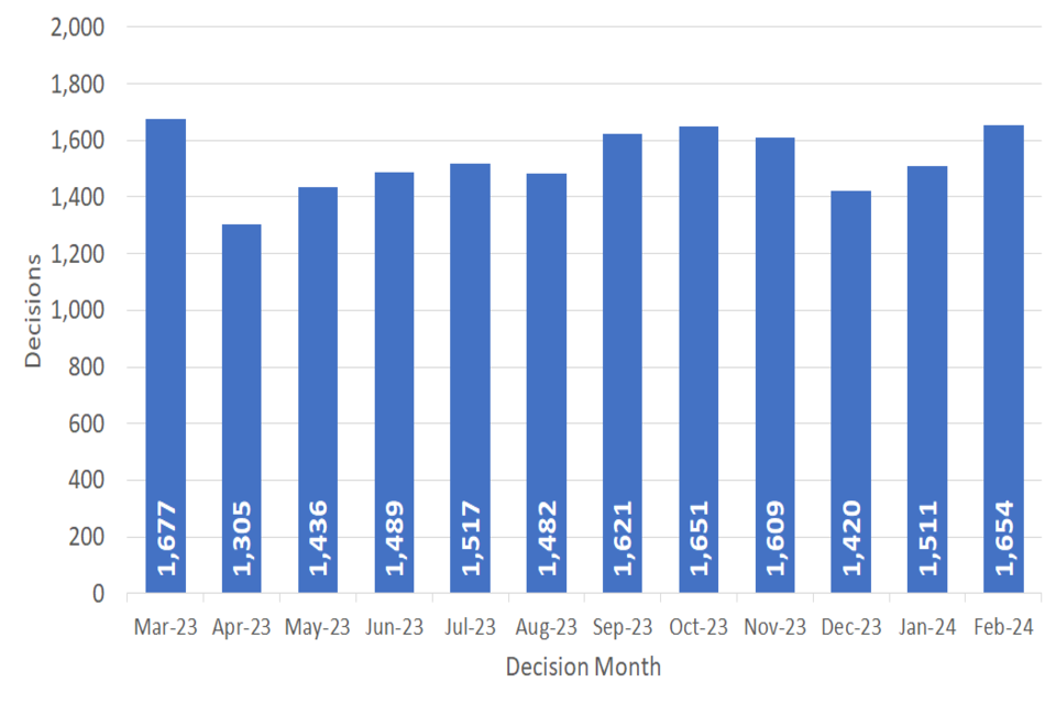 The number of decisions issued in February 2024 was 1,654, with a monthly average of 1,531 over the past 12 months.
