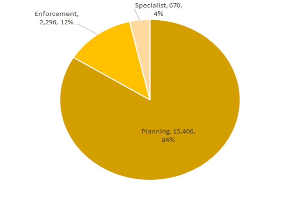 The large majority of cases over the past 12 months were planning (15,406). This is about 84% of all appeal decisions made. There were 2,296 enforcement decisions and 670 specialist decisions. These totals are also shown in Table 4 above and Figure 4 below.