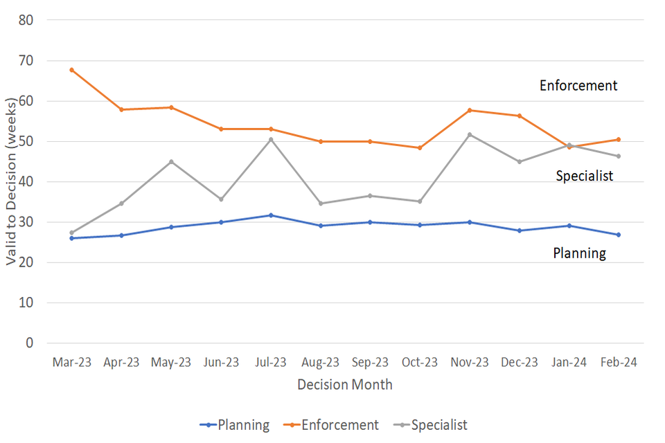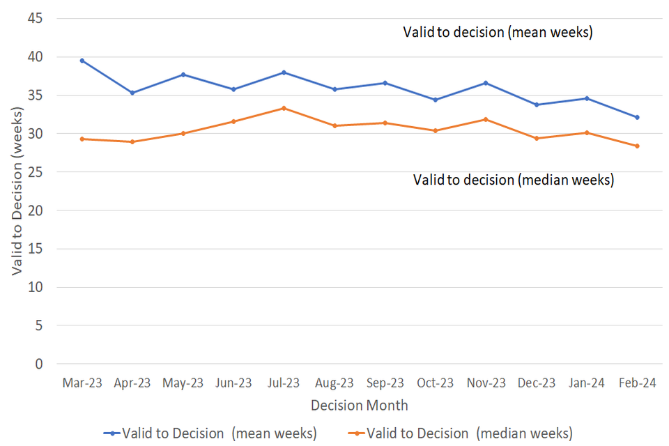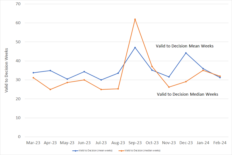 The median valid to decision time was 28 weeks in February 2024, as seen in Figure 1 and Table 1 below. The median valid to decision time has fallen slightly (1.7 weeks lower than January).